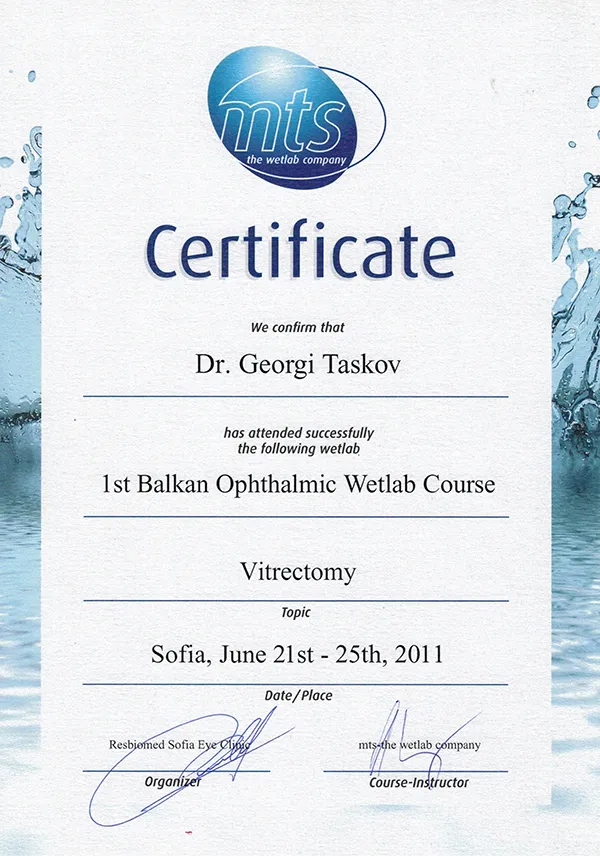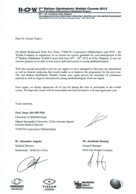 - "Рефрактивна подмяна на лещата" на 2-рия Балкански уетлаб курс 26-30 юни 2012, София