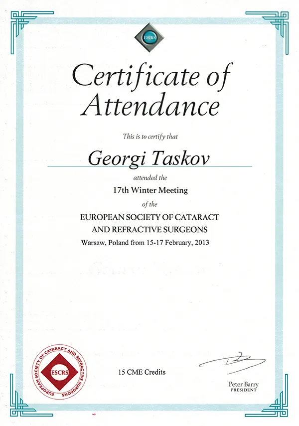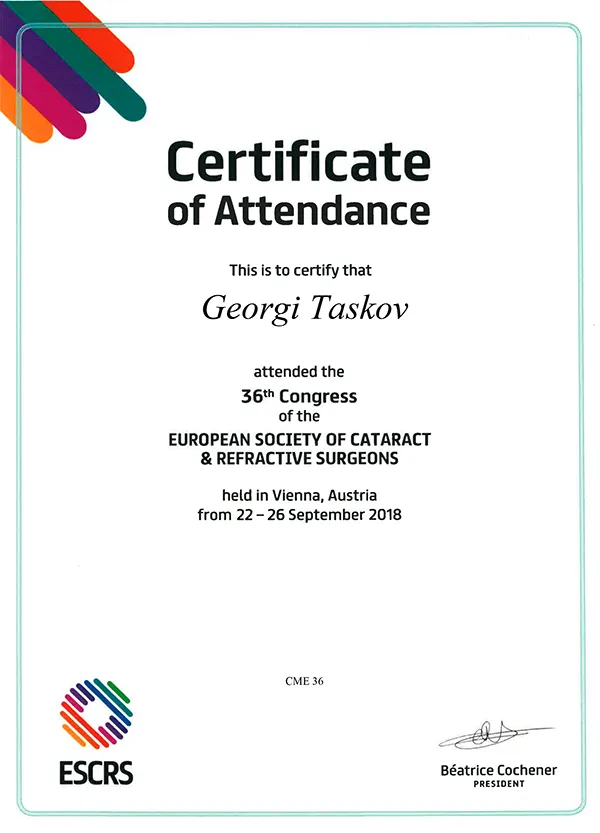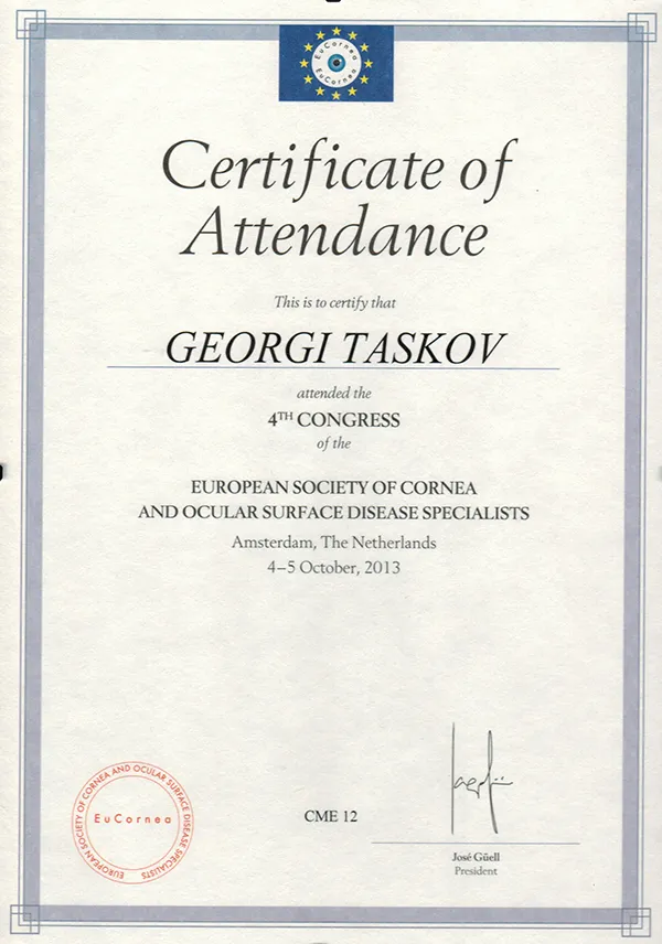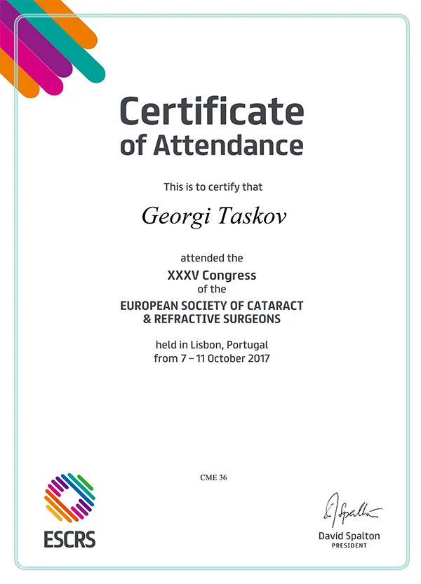 - Модул "Роговица и роговична рефрактивна хирургия" от Европейския университет за задълбочено обучение в офталмологията - 4-8 септември 2017, Лугано