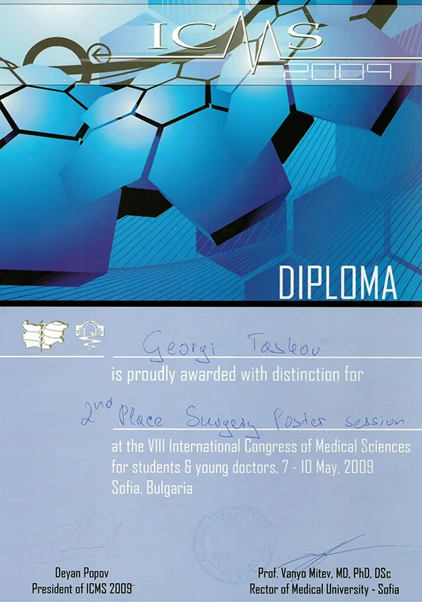 - 2-ро място Хирургична постерна сесия на 8ия ICMS 2009, София, България