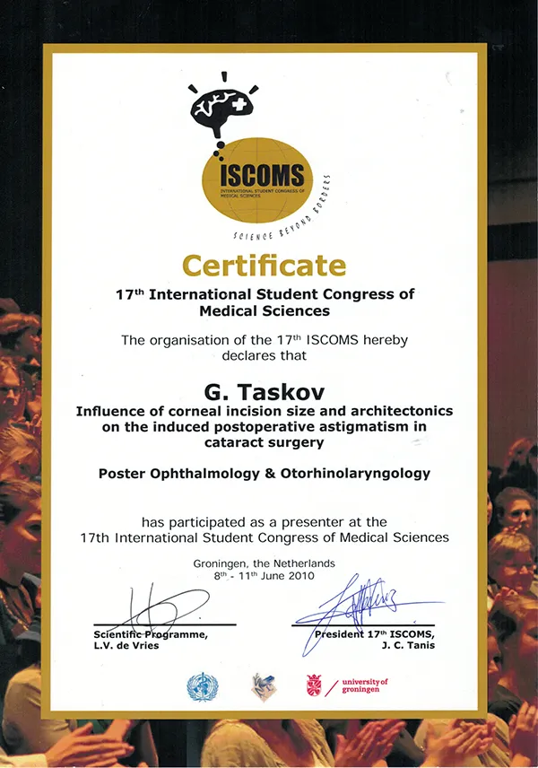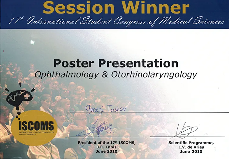 - 1-во място Постерна сесия Офталмология и оториноларингология на 17ия ISCOMS 2010 Грьонинген, Холандия