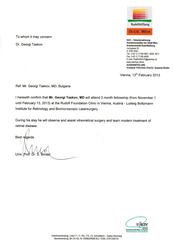 - Специализация в операции на заден очен сегмент при проф. Биндер и нейния екип, очно отделение на болница Рудолфщифтунг - 2012/2013, Виена